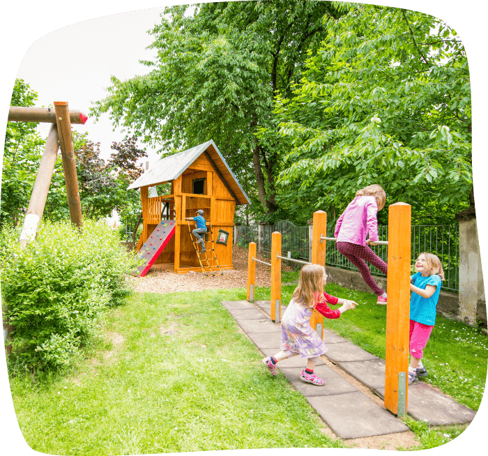 Ab ca. 12:00 Uhr gehen wir täglich und bei jedem Wetter in unseren großen Garten. Die Kinder spielen an der frischen Luft.