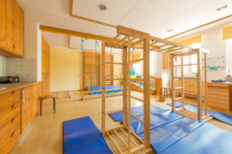 Die gesamte Einrichtung, einschließlich Außengelände, ist barrierefrei konzipiert. Die verschiedenen Räumlichkeiten bieten den Kindern die Möglichkeit, sich je nach Bedarf für Aktivitäts- oder Ruhezonen zu entscheiden.