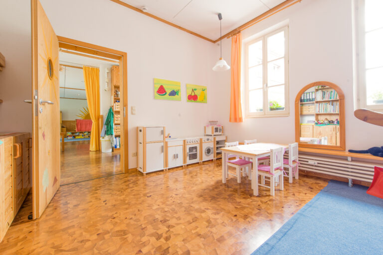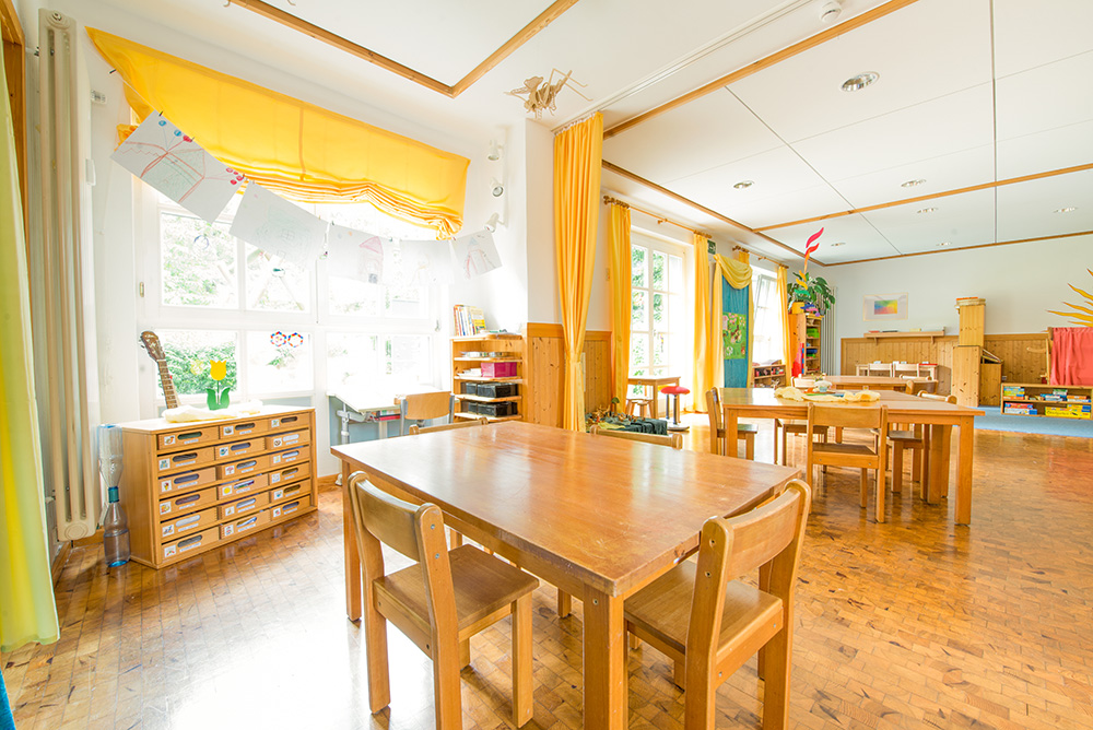 als Arbeits- und Gemeinschaftsraum unterteilt in die Materialbereiche nach Montessori, mit Leseecke